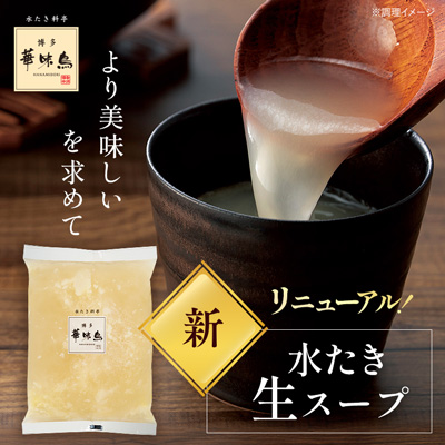 | 「水たき料亭 博多華味鳥」の味に、より近づけた《水たき生スープ》が誕生しました。 従来品よりもさらに「博多華味鳥」店舗の味に近い、雑味の少ないクリアで深みのある味わいをご家庭でもお楽しみいただけます。 ※水たき生スープは到着後、必ず冷凍保存をお願いします。 |