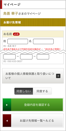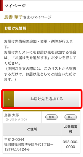 あなたがマイページで登録しているお届け先住所を変更・追加または削除することができます。
